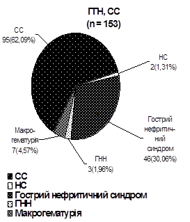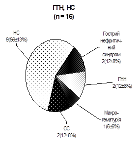 У переважної більшості хворих на ХГН, СС початок хвороби проявлявся СС. У 17,83% хворих цієї групи першим проявом хвороби був гострий нефритичний синдром, який дещо рідше спостерігався при ХГН із НС. У групі хворих на ХГН, НС в 42% випадків захворювання розпочиналося із СС, але в подальшому відбулась трансформація в НС (82±12%, n=9) на тлі ГРВІ, ще у двох хворих – після пневмонії. Дещо частіше у хворих з сечовим варіантом перебігу ХГН (9,4%, n=11), ніж у хворих із НС (8±5%, n=2) в дебюті хвороби спостерігалась макрогематурія.