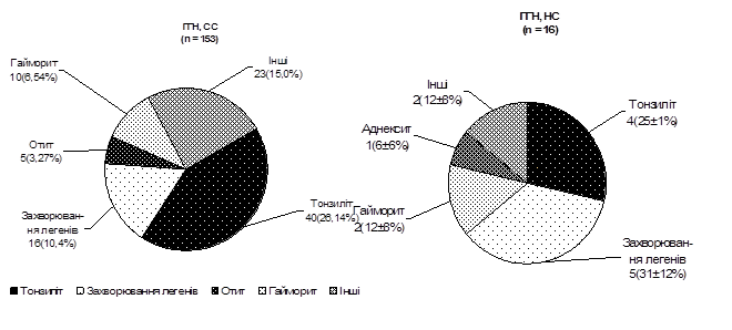 У переважної більшості хворих на ГГН виявлено фактор ризику у вигляді вогнищ хронічної інфекції. В осіб на ГГН, СС цей показник становив 61,43%, у пацієнтів на ГГН, НС – 88,8%. Частота хронічних вогнищ інфекції та їх характерстика показані на рис. 3.