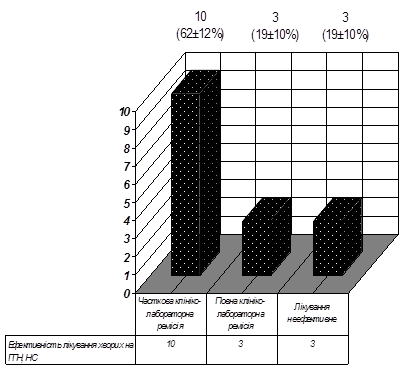 Таким чином, у переважної більшості – (17 з 18) хворих (94±6%) проведене лікування було ефективним. На тлі комбінованого лікування кортикостероїдами (КС) та цитостатиками (ЦС) ЧКЛР розвинулась у 89±6% хворих, тоді як при лікуванні лише КС – у 80±6%. У той же час при комбінованому лікуванні в одного хворого (8±8%) відмічено повну клініко-лабораторну ремісію (ПКЛР). Усі хворі, в яких розвинулась ЧКЛР, отримували ІАПФ, причому у одного хворого розвинулась ПКЛР.