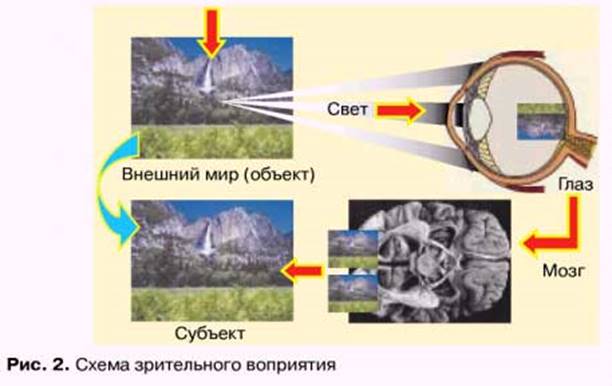 Оптическая система глаза состоит из роговицы, влаги передней камеры, хрусталика и стекловидного тела. Лучи света проходят прозрачные среды глаза, преломляются на поверхностях основных линз - роговицы и хрусталика и, фокусируясь на сетчатке, "рисуют" на ней изображение предметов внешнего мира (рис.2). Зрительный акт начинается с преобразования изображения фоторецепторами в нервные импульсы, которые после обработки нейронами сетчатки передаются по зрительным нервам в высшие отделы зрительного анализатора. Таким образом, зрение можно определить как субъективное восприятие объективного мира посредством света с помощью зрительной системы.