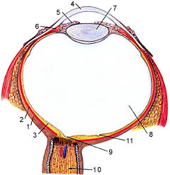 Глаз (глазное яблоко, Bulbus oculi) имеет почти правильную округлую форму, размер его передне-задней оси примерно 24 мм, весит около 7 г и анатомически состоит из трех оболочек (наружной - фиброзной, средней - сосудистой, внутренней - сетчатки) и трех прозрачных сред (внутриглазной жидкости, хрусталика и стекловидного тела).
