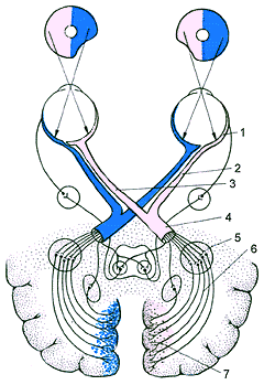 Под воздействием световых лучей в фоторецепторах происходит фотохимическая реакция (распад зрительных пигментов), в результате которой выделяется энергия (электрический потенциал), несущая зрительную информацию. Эта энергия в виде нервного возбуждения передается в другие слои сетчатки - на клетки-биполяры, а затем на ганглиозные клетки. При этом, благодаря сложным соединениям этих клеток, происходит удаление случайных "помех" в изображении, усиливаются слабые контрасты, острее воспринимаются движущиеся предметы. Нервные волокна со всей сетчатки собираются в зрительный нерв в особой области сетчатки - "слепом пятне". Оно расположено в том месте, где зрительный нерв выходит из глаза, и все, что попадает на эту область, исчезает из поля зрения человека. Зрительные нервы правой и левой стороны перекрещиваются, причем у человека и высших обезьян перекрещиваются лишь половина волокон каждого зрительного нерва. В конечном счете вся зрительная информация в кодированном виде передается в виде импульсов по волокнам зрительного нерва в головной мозг, его высшую инстанцию - кору, где и происходит формирование зрительного образа (рис. 4).