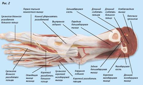 Стопа производит следующие движения: сгибание, разгибание, отведение, приведение, поворот внутрь и наружу. Все движения осуществляются в суставах при помощи мышц голени (рис.2). На стопе располагаются сухожилия длинных мышц голени, сгибающих и разгибающих стопу и ее пальцы, а также собственные мышцы стопы.