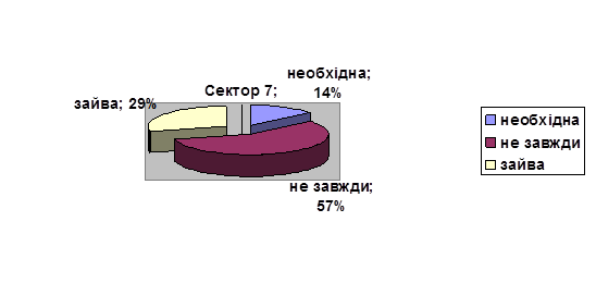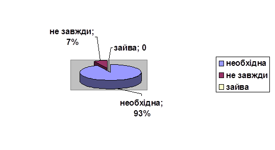 У нашому дослідженні породіллі мали нагоду висловитися про роль підтримки під час пологів. Думки опитуваних розділилися за таким співвідношенням:з думкою про те що підтримка під час пологів необхідна погодилися 14%; 57% досліджуваних з контрольної групи вважають ,що підтримка потрібна не завжди; з тим що воно зайва пологодилися 29% досліджуваних.
