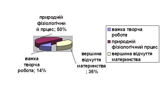 Пологи для 14% досліджуваних є важка творча робота, 50% вважають що це природній фізіологічний процес, 36% пологи сприймають як вершину відчуття материнства.