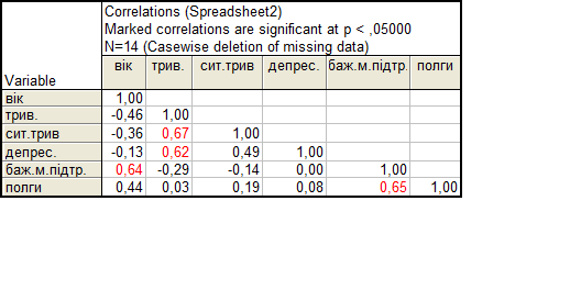 При проведенні кореляційного аналізу між показниками у першій групі досліджуваних, тобто жінок які народжували у звичних пологах, ми враховували такі показники: вік досліджуваних; рівень тривожності; рівень ситуативної тривожності; рівень депресивності; рівень потреби у підтримці під час пологів; які по рахунку це пологи. Ми отримали такі результати. (табл. 2)