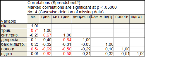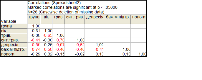 Після проведення кореляційного аналізу між показниками двох груп досліджуваних ми отримали такі дані. Між фактором тривожності і фактором віку існує обернений зв’язок р= -0. 65. Фактор ситуативної тривожності обернено корелює з фактором група р= -0. 41 і має прямий кореляційний зв’язок з фактором тривожності р= 0. 70. Показник депресивності обернено корелює з показником, який вказує на приналежність до певної групи і становить р= -0. 55, прямо корелює з показником тривожності р= 0. 57 і з показником ситуативної тривожності р= 0. 62. Фактор який вказує на рівень важливості мати підтримку під час пологів обернено корелює з показниками тривожності і ситуативної тривожності р= -0. 40, а також з показником депресивності р= -0. 41 і утворює прямі кореляційні зв’язки з показником віку р= 0. 50 ,і фактором групи р= 0. 74.