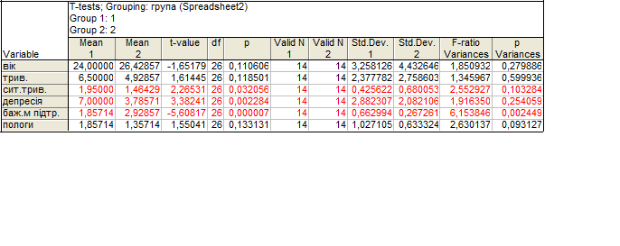 Дані порівняльного аналізу двох груп досліджуваних наведено у табл. 5. З цього видно що існує суттєва відмінність між двома групами за фактором ситуативної тривожності, фактором стану депресивності і фактором, який вказує на необхідність підтримки під час пологів.