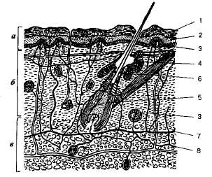 Рис. 13.17. Строение кожи человека: а — надкожица (эпидермис); б — собственно кожа (дерма); в — подкожная жировая клетчатка; 1 —роговой слой эпидермиса; 2 —слой живых клеток эпидермиса; 3 — рецепторы кожи; 4 — сальные железы; 5 — потовые железы; б — корень волоса; 7 — кровеносный сосуд; 8 — нерв.