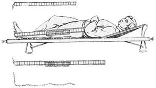 При переломе бедра - требуется особенно тщательная иммобилизация. Для этого используют три лестничных шины: две лестничные шины соединяют, чтобы получилась шина длиной от подмышечной впадины до внутреннего края стопы, изогнутая у стопы в виде буквы "Г", эта шина наружная; вторая шина накладывается на заднюю поверхность конечности от лопатки или ягодицы до кончиков пальцев стопы и так же изогнута; третья шина располагается на внутренней поверхности конечности от промежности до края стопы.Иммобилизация лестничными шинами Крамера: