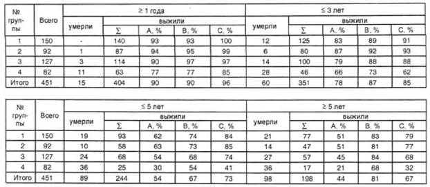 Следует особо оговорить принцип составления таблиц 2 и 3. Число умерших в каждом периоде наблюдений суммировалось с числом умерших в предшествующий период. Число онкобольных с неизвестным результатом лечения указано только для конкретного периода наблюдений. В этом