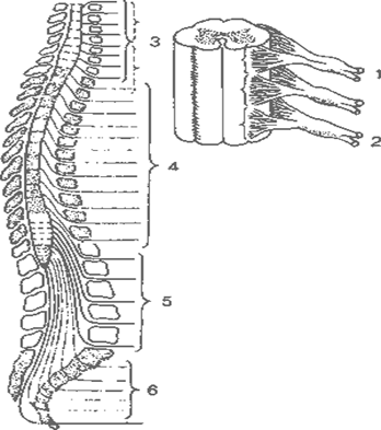 1 – задний корешок; 2 – передний корешок; 3 – шейные сегменты С 1 - С 8) ; 4 – грудные сегменты (Т 1 - Т 12) ; 5 – поясничные сегменты (L1 - L5) ; 6 – крестцовые сегменты (S1 - S5)
