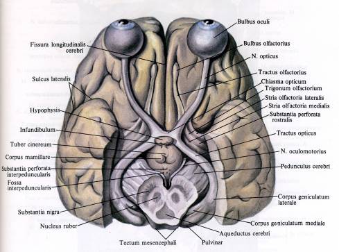 Зрительный нервы и тракты; нижняя поверхность мозга. (Большая часть височной долей и мост удалены.)