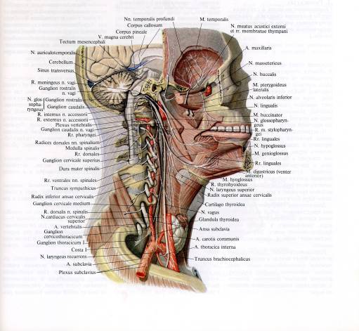 Нерв головы и шей; вид справа (позвоночный канал вскрыт; удалены задней отделы черепа головного мозга, правая половина нижней челюсти, частично жевательные мышцы, общая сонная артерия).