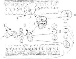Рис. 1. Схема жизненного цикла дизентерийной амебы (Entamoehahistolytica). 1,7,8-цисты; 2,3 - малые вегетативные формы: 4,5,6 - большие вегетативные формы.
