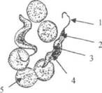 Рис. 3. Трипаносома (Trypanosomabruceigambiense). 1 - жгутик; 2 - кинетопласт; 3 - ундулирующая мембрана; 4 - ядро; 5 - эритроцит.
