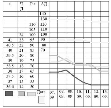| 13.09.07 | Состояние удовлетворительное, жалоб нет. Температура 36.6 оС, АД: правая рука -125/85 мм. Рт. Ст., левая рука – 125/85 мм. Рт. Ст., пульс – 72 уд/мин. ЧД 17/мин. Дыхание везикулярное, шумов нет, границы легких не изменены, тоны сердца ясные ритм правильный, шумов нет, границы абсолютной и относительной тупости сердца не изменены. Живот при осмотре симметричный, пальпаторно мягкий, безболезненный, границы печени и селезенки не изменены. Лимфоузлы не пальпируются. Почки не пальпируются, симптом Пастернацкого положительный справа. Физиологические отправления в норме. | Tab. Omeprozoli 0.02 2 р/д, до еды у/в. Tab. Cerucali 0.01 3 р/д за 10 мин до еды Tab. Amoxicyllini 0.5 4 р/д Tab. Promedoli 0.5 2 р/д после еды |