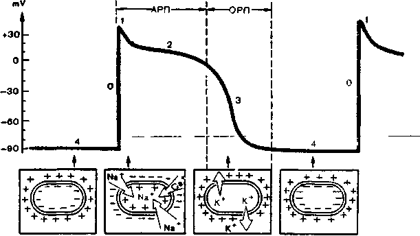Фаза 0. Во время этой начальной фазы возбуждения - фазы деполяризации - резко увеличивается проницаемость мембраны клетки для ионов Na, которые быстро устремляются внутрь клетки (быстрый натриевый ток). При этом, естественно, меняется заряд мембраны: внутренняя поверхность мембраны становится положительной, а наружная - отрицательной. Величина ТМПД изменяется от -90 mV до +20 mV, т.е. происходит реверсия заряда - перезарядка мембраны. Продолжительность этой фазы не превышает 10 мс.