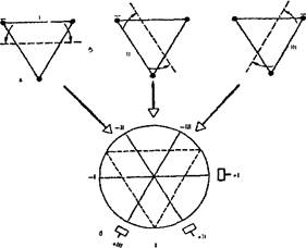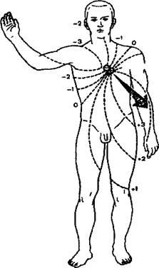Разности потенциалов между вершинами равностороннего треугольника называют стандартными передними отведениями и обычно обозначают римскими цифрами I, II, Ш. Усиленные униполярные отведения позволяют измерять разности потенциалов между одной из вершин треугольника и средними значениями потенциалов на двух других вершинах. В случае отведений I, II, Ш изучается изменение вектора электрического поля сердца во фронтальной плоскости; в случае шести дополнительных отведении, называемых грудными, изучаются изменения вектора электрического поля сердца в поперечной плоскости.