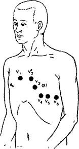 При записи ЭКГ применяют в большинстве случаев двухполюсные отведения, причем активным является красный электрод, индифферентным — белый, а зеленый служит заземлением. Для выявления нарушений коронарного кровообращения красный электрод помещают в пятом межреберье слева по среднеключичной или передней подмышечной линии, белый — над рукояткой грудины или под ключицей справа и зеленый — над V или VI ребром справа по среднеключичной линии. Получают видоизмененное отведение V4 . Для диагностики аритмий лучше помещать красный электрод на нижнюю часть грудины вблизи от мечевидного отростка, белый — над рукояткой грудины, зеленый — над V ребром по среднеключичной линии. Это видоизменное отведение V1 . При таком расположении электродов лучше выявляется зубец Р.