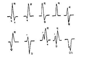 Максимальная продолжительность желудочкового комплекса не превышает 0,10с (чаще 0,07-0,09 с). Амплитуда и соотношение положительных (R) и отрицательных зубцов (Q и S) в различных отведениях во многом зависят от поворотов оси сердца вокруг трех его осей: переднезадней, продольной и сагиттальной.
