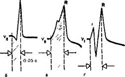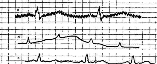 а - наводные токи - сетевая наводка в виде правильных колебаний с частотой 50 Гц; б - «плавание» (дрейф) изолинии в результате плохого контакта электрода с КОЖЕЙ; в - наводка, обусловленная мышечным тремором (видны неправильные частые колебания). При записи ЭКГ со скоростью 50 мм с"1 мм на бумажной ленте соответствует отрезку времени 0,02 с, 5 мм - 0,1 с, 10 мм - 0,2 с, 50 мм - 1,0 с. В этом случае ширина комплекса QRS обычно не превышает 4-6 мм (0,08-0,12 с), а интервал Q- Т- 20 мм (0,4 с).