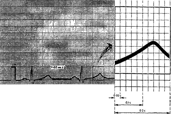 Рисунок 25. Запись ЭКГ на миллиметровой бумаге со скоростью 50 мм с"1 . Каждый миллиметр бумаги по горизонтали соответствует 0,02 с, каждые 5 мм - 0,1 , а 10 мм - 0,2 с. Справа - увеличенный в 5 раз отрезок кривой.