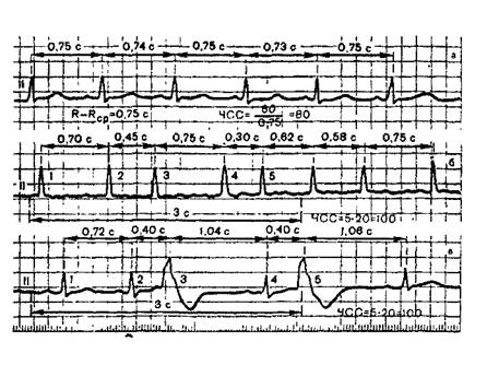 Пример подсчета ЧСС при правильном ритме приведен на рисунке 25а.