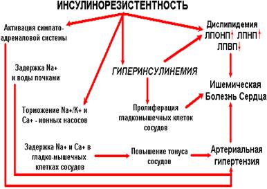 Артериальная гипертензия (АГ) является одним из проявлений МС. Центральная нервная система и почки сохраняют чувствительность к инсулину, что в условиях ГИ является фактором активации симпатической нервной системы и повышения сосудистого тонуса. В условиях симпатикотонии увеличивается фильтрация глюкозы клубочками почек, что приводит к усилению реабсорбции натрия в проксимальных канальцах нефрона. В результате происходит задержка жидкости и электролитов, часть из которых остаётся в сосудистой стенке.