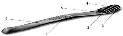 Скребки для языка (рис. 8) многие специалисты находят более эффективными средствами для удаления налета со спинки языка, чем щетки. Дизайн скребков для языка разнообразен, но во всех моделях имеется одна или несколько рабочих плоскостей (металлических или пластиковых), располагаемых перпендикулярно к очищаемой поверхности. К достоинствам отдельных моделей скребков относят наличие нескользкой ручки с опорной площадкой для большого пальца (рис. 1, 6), многорядное расположение разновысоких «лезвий» (рис. 8, п. 2, 4) из атравматичных материалов со скругленные углами (рис. 8, п. 2, 3), наличие промывных пространств (рис. 8, п. 5).