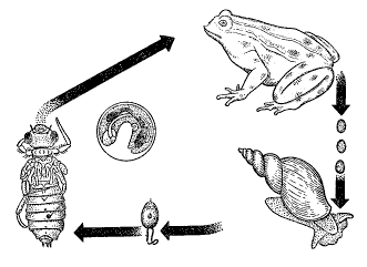 · проникновение и инцистирование в промежуточном хозяине (стадия метацеркарии ), при этом промежуточный хозяин служит пищей для окончательного хозяина или следующего промежуточного хозяина (встраивание в трофическую цепь);