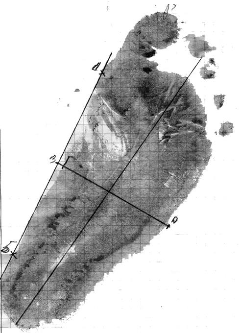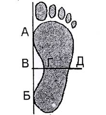 Обработка плантограмм велась по методу Штритера (рис.1.)., который состоит в том, что к наиболее выступающим точкам медиального края отпечатка стопы проводится касательная линия (АБ), из середины которой (точка В) восстанавливается перпендикуляр, пересекающий медиальный край в точке Г, а материальный – в точке Д