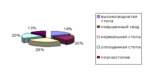 В результате анализа полученных плантограмм мы получили следующую картину (рис.3.): среди обследованных ребят нормальный свод стопы имеют 18 человек (т.е. 28 %). Оставшиеся ученики имели различные отклонения от нормы: У 8 учащихся (13% от общего количества обследованных) обнаружено плоскостопие, 12 учеников (19%) имеют высокосводчатую стопу и еще 13 учеников (20%) имеют повышенный свод.