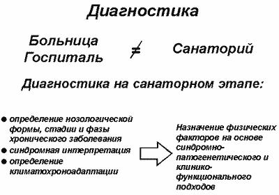 Диагностический процесс в санаториях строится обычно как копия (неизбежно ухудшенная) больничной диагностики, нет правильного понимания клинических различий контингентов. В санатории прибывают больные, как правило, в фазах ремиссии хронических заболеваний, т.е. с малосимптомными формами. От врача-курортолога это требует гораздо большей врачебной наблюдательности и зоркости, чем от больничного коллеги. С другой стороны, задача санаторно-курортного лечения — общее оздоровление — требует не только диагностики болезни, но и оценки общего состояния реактивности и климатохроноадаптации. Основное значение имеет констатация и динамическая оценка функциональных показателей. Диагностика не ограничивается определением нозологической формы, но и требует синдромной интерпретации, поскольку назначение физических факторов осуществляется на основе синдромно-патогенетического и клинико-функционального подходов. (Рис.6) Хорошие результаты дает двухэтапная система диагностики. Использование такой системы позволяет значительно повысить выявляемость заболевания, а значит, и проводить полноценное комплексное лечение больных. (Рис.7).