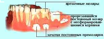 Постоянные зубы закладываются до рождения. Их зачатки возникают на 5 месяце беременности, а формирование их длится в течение 5 лет. Окончательно минерализация постоянных зубов завершается только к 8 годам.