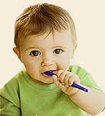Со времени прорезывания первого зуба следует использовать резиновую зубную щеточку, которую родители надевают на палец и чистят ребенку уже имеющиеся в полости рта зубы. С 3-х лет ребенка можно самостоятельно учить чистить зубы мягкой зубной щеткой, но это необходимо делать под контролем, что бы ребенок не повредил твердые ткани формирующейся эмали.