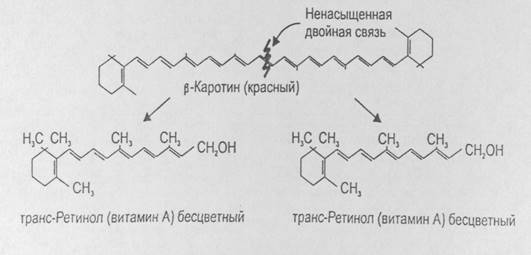 Перекись водорода. При проведении отбеливания перекись водорода проникает через органический матрикс эмали и дентина и происходит взаимодействие активных радикалов с ненасыщенными связями молекул, как, например, в реакции с b-каротином, когда в результате окисления окрашенная в яркий красный цвет молекула (b-каротина расщепляется на две бесцветные молекулы транс-ретинола: