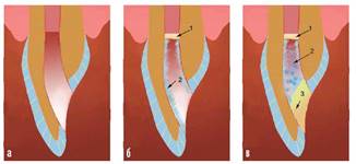 Рис. 3: а — с эмали и дентина депульпированного зуба удален пломбировочный материал, б — устье корневого канала изолировано фосфат-цементом, внутрь коронки нанесен отбеливающий гель, в — "отбеливание на ходу". 1 — фосфат-цемент, 2 — отбеливающее вещество, 3 — герметичная пломба