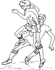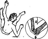 Рис. 23. Типичный механизм травмы капсульно-связочного аппарата: падение с поворотом при фиксированной стопе, отведение голени и наружная ротация верхней половины туловища