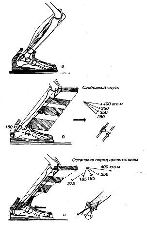 а — современная лыжная обувь, фиксирующая голеностопный сустав, вызывает три вида травм: в области верхнего края ботинка, компрессию переднего края боль-шеберцовой кости, разрыв ахиллова сухожилия; б, в — направление нагрузки при свободном спуске и столкновении с препятствием.