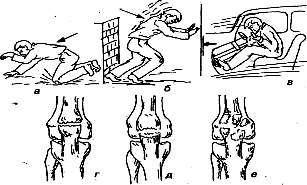 а — падение на колено, б — резкое сокращение четырехглавой мышцы, в _ удар при резком торможении, г — поперечный перелом, д — отрывной,