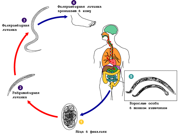 Половозрелые самки паразитического поколения локализуются в организме человека в толще слизистой оболочки, главным образом в либеркюновых железах двенадцатиперстной кишки, при интенсивной инвазии проникают в желудок, слизистую тонкого кишечника, панкреатические и желчные ходы. Оплодотворенные самки откладывают яйца, из которых выходят личинки, достигающие в длину 0,2—0,3 мм. Самцы после оплодотворения погибают и с фекалиями удаляются из организма. Личинки выделяются с фекалиями во внешнюю среду, где либо превращаются в филяриевидные личинки (гомогения), либо в свободноживущих половозрелых самцов и самок (гетерогония), способных откладывать яйца. В окружающей среде рабдовидные личинки при 4-16С остаются живыми, но не развиваются; при температуре ниже 4С, а также при высыхании почвы они погибают. Гельминты быстро погибают под воздействием 10% раствора хлорида натрия, 2% карбатиона, калийных, азотных, фосфорных минеральных удобрений.