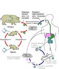 Факторы передачи человеку. В современных условиях человек, очевидно, чаще всего бывает тупиковым хозяином (однако иногда условия захоронения могут способствовать распространению трихинелл, содержащихся в трупе человека). Поэтому рассмотрим лишь конечные факторы передачи.
