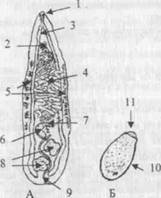 Рис. 1. Марита (А) и яйцо (Б) кошачьего сосальщика ( Opistorchis felineus ). 1 - ротовая присоска: 2 - брюшная присоска; 3 - ветви кишечника; 4 - матка; 5 - желточники; 6 - семяприемник; 7 -яичник; 8 - семенники; 9 - выделительный канал; 10 - оболочка, 11 - крышечка.