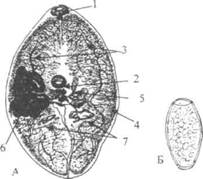 Рис. 2. Легочныйсосалыцик(Paragonimus westermani). А - половозрелая форма. Б -яйцо. 1 - ротовая присоска; 2 - брюшная присоска; 3 -кишечник; 4 - желточники; 5 - яичник; 6 - матка; 7 - семенники.
