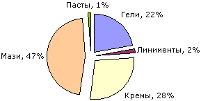 По консистенции выделяют жидкие мази (линименты), гели, мягкие мази (кремы), собственно мази, пасты и сухие мази, представляющие собой полуфабрикаты, которые предназначены для разведения водой или жирами. Гели — это мази вязкой консистенции, способные сохранять форму и обладающие упругостью и пластичностью. По типу дисперсных систем различают гидрофильные и гидрофобные гели. Кремы (мягкие мази) — мази мягкой консистенции, представляющие собой эмульсии типа “масло — вода или “вода — масло”. Плотные мази (пасты) содержат более 20—25 % сухих лекарственных веществ. В зависимости от консистенции мази втираются, намазываются или накладываются на кожу.