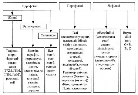 В основу класифікації повинна бути покладена найбільш характерна ознака, що дозволяє об'єднати речовини в єдину, органічно зв'язану групу. Така характерна ознака для всіх речовин чи композицій основ -їх здатність взаємодіяти з водою. По інтенсивності взаємодії з водою всі основи поділяють на три групи: гідрофобні, гідрофільні та дифільні . Така класифікація вважається найбільш раціональною. Вона прийнята ДФ XI.