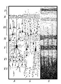 На рисунке 1 представлена схема цитоархитектонического строения новой коры. В разделе А окрашены только тела клеток, Б окрашены отдельные клетки с отростками; В окрашены волокна. Слои коры: I — молекулярный слой; II — наружный зернистый слой; III — пирамидный слой; IV — внутренний зернистый слой; V — ганглионарный слой; VI — полиморфный слой.