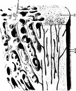 Наружный слой кости представлен толстой (в диафизах трубчатых костей) или тонкой (в эпифизах трубчатых костей, в губчатых и плоских костях) пластинкой компактного вещества, substantia compacta. Под компактным веществом располагается губчатое (трабекулярное) вещество, substantia spongiosa (trabe-cularis), пористое, построенное из костных балок с ячейками между ними, по виду напоминающее губку. Рисунок строения кости хорошо виден на срезах (шлифах) костей. Внутри диафиза трубчатых костей находится костномозговая полость, cavitas medullaris, содержащая костный мозг. Компактное вещество построено из пластинчатой костной ткани и пронизано системой тонких питательных канальцев, одни из которых ориентированы параллельно поверхности кости, а в трубчатых костях - вдоль длинного их размера (центральный, или гаверсов, канал ), другие, прободающие (каналы Фолькмана) – перпендикулярно поверхности. Эти костные канальцы служат продолжением более крупных питательных каналов, candles nutrlcii (nutriensii), открывающихся на поверхности кости в виде отверстий, один - два из которых бывают довольно крупными. Через питательные отверстия в кость, в систему ее костных канальцев проникают артерия, нерв и выходит вена.