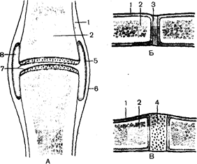 А-сустав. Б-синдесмоз. В-синхондроз. Г-симфиз (гемиартроз). 1 - надкостница; 2 - кость; 3 - волокнистая соединительная ткань; 4 - хрящ; 5 - синовиальная мембрана; 6- фиброзная мембрана; 7 - суставной хрящ; 8-суставная полость; 9-щель в межлобковом диске; 10-межлобковый диск.